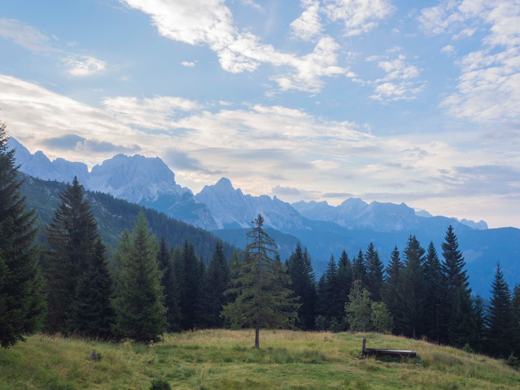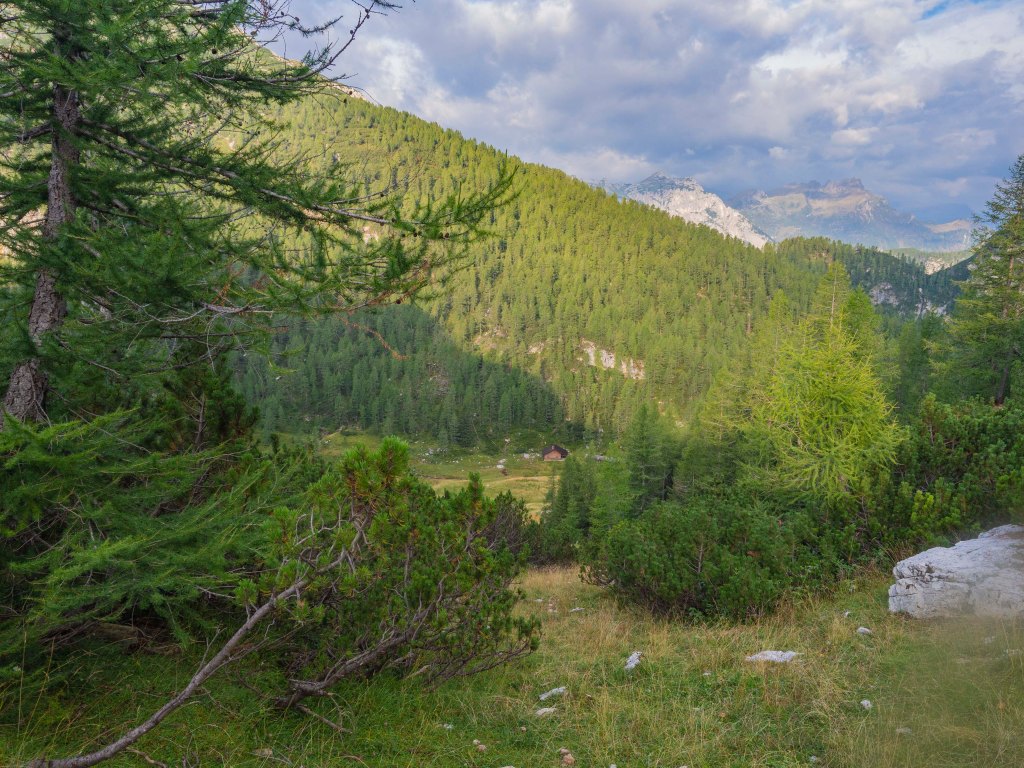 Ancora in costante salita, seguiamo il sentiero che si snoda sotto al bosco, tra radici, pietre e terra, ci conduce senza troppi patemi, in circa 20 minuti di cammino ad un bel capitello ligneo, all’inizio di un pendio erboso, in cima al quale si riesce a distinguere, con la Luna ancora alta nel cielo sullo sfondo, la Forcella del Camp (1933 m).