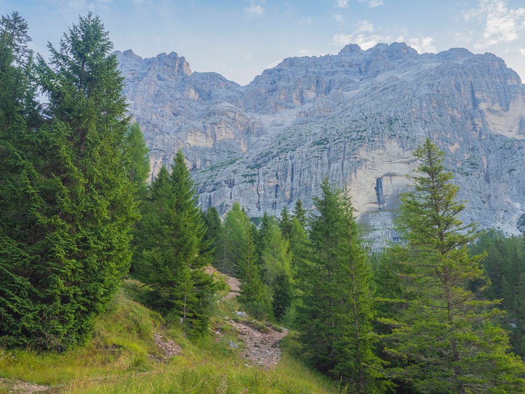 Questo sentiero, dapprima largo, su fondo erboso, procedendo sempre in salita, va via via a stringersi attraversando zone boschive alternate a slarghi pratosi da cui è possibile soffermarsi ad ammirare a Nord la parete verticale della Moiazza Sud e tutto attorno, da Est a Sud la catena delle Dolomiti di Zoldo e quindi quelle Bellunesi.