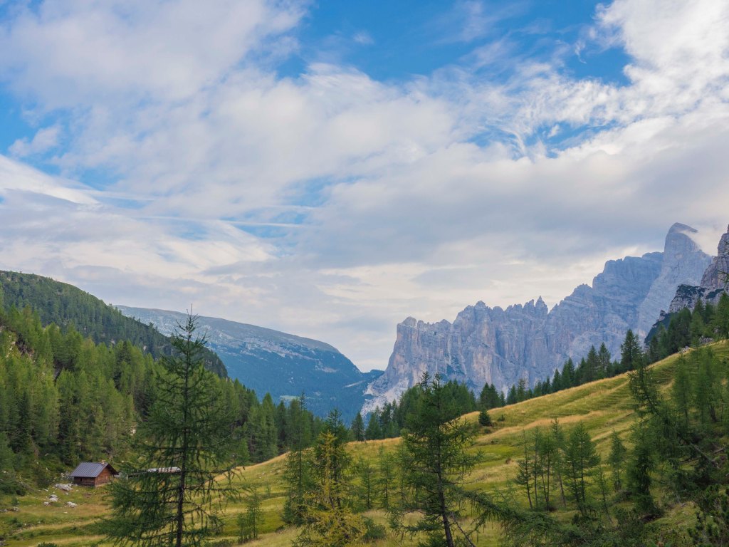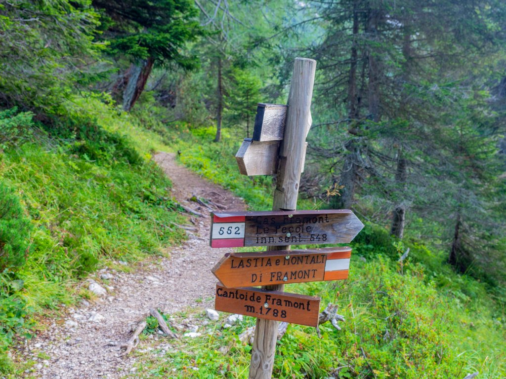 Con passo deciso, in meno di mezz’ora arriviamo al congiungimento con l’Alta Via n.1 sul sentiero 554, ben indicato da un cartello e, seguendo le indicazioni per Lastia e Mont’alt de Framont, proseguiamo verso sinistra.