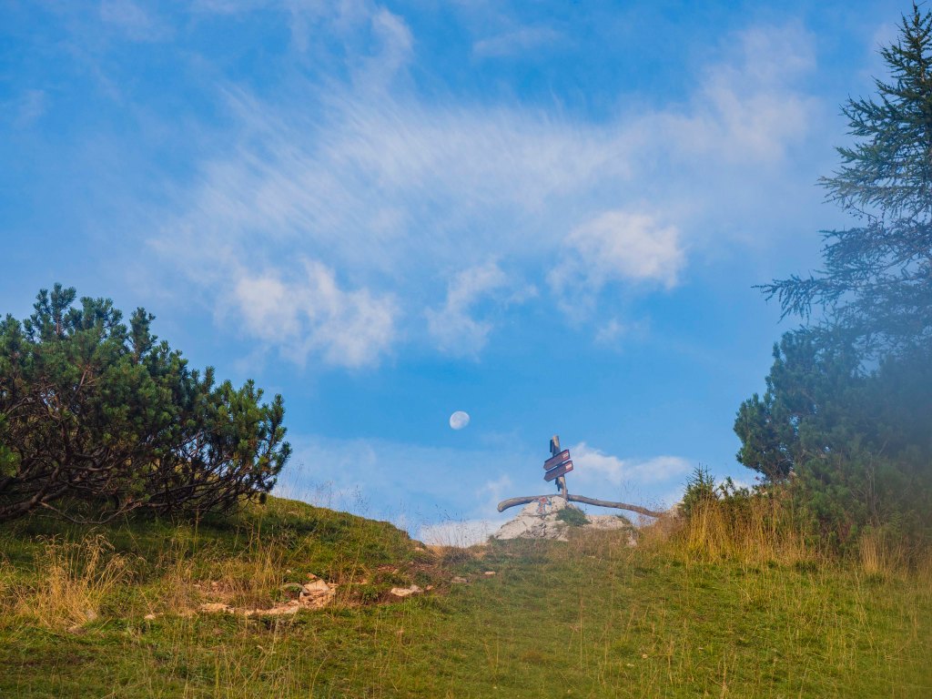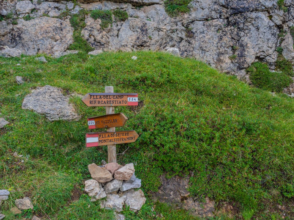 Qui ci troviamo di fronte ad un tratto in cui il sentiero lascia un po’ di incertezza per la conformità rocciosa del suolo sul quale ovviamente non è facile distinguere la traccia, ma bisogna essere bravi a non farsi ingannare dalla via che sale dalla forcella altrimenti ci si ritroverà a dover affrontare una discesa a dir poco proibitiva. Con un po’ di calma e attenzione si prosegue salendo sul tratto di roccia che c’è davanti a noi, e spostandoci un po’ verso destra ecco che si scorge subito, inchiodato al tronco di un larice, il cartello che indica la via corretta da seguire.
