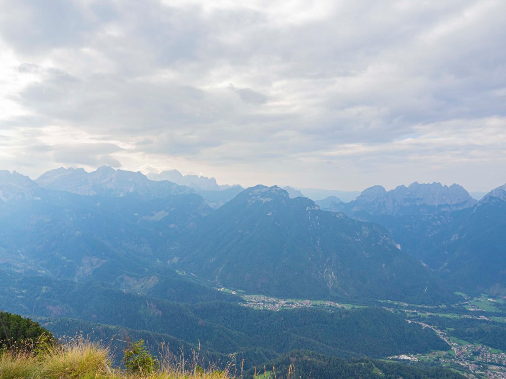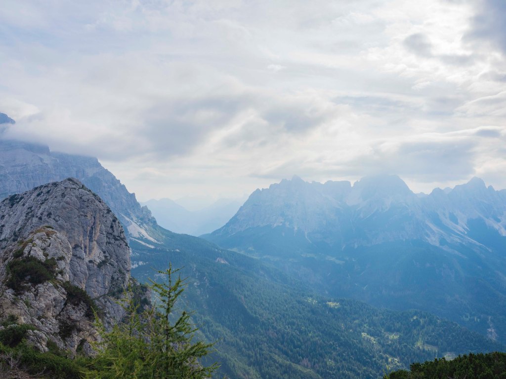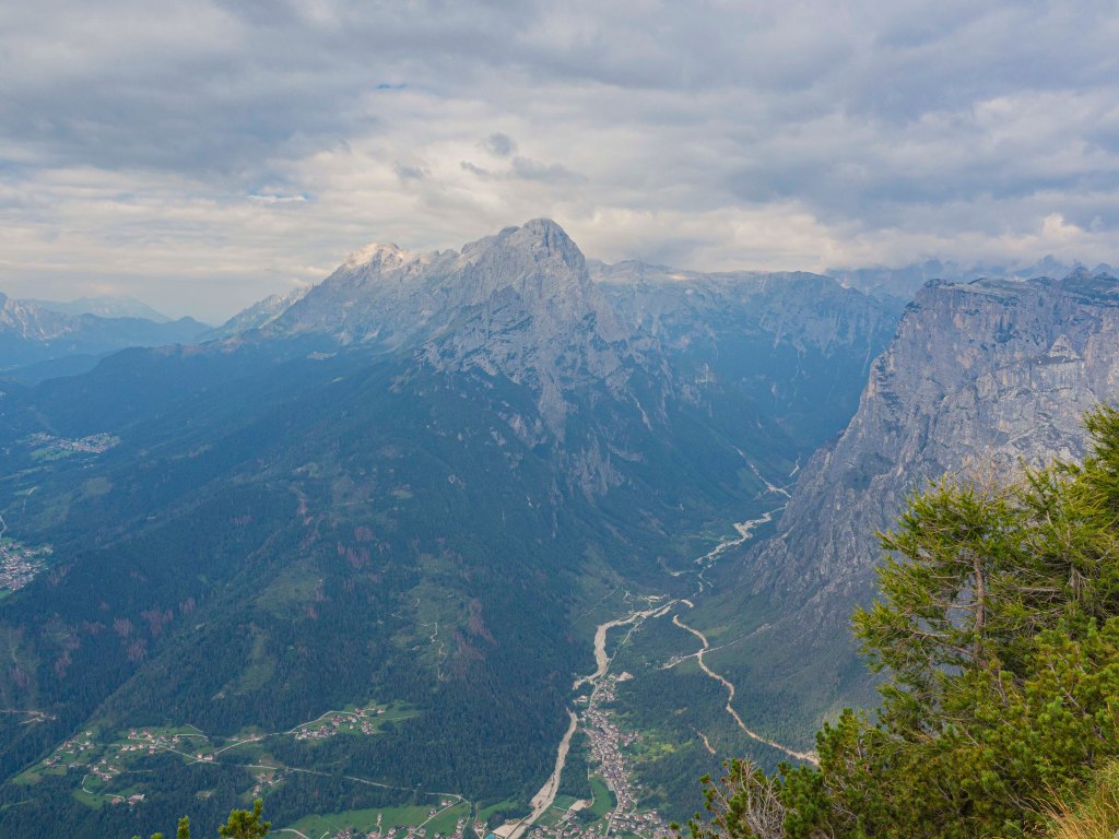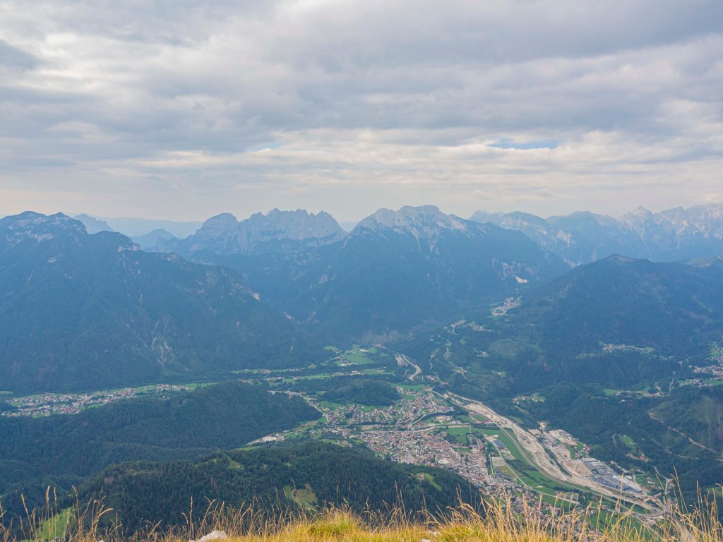 Ovviamente la vista da qua su è a dir poco sensazionale, peccato per il cielo che si è sempre più coperto. Da qui dominiamo, con terrazzo a strapiombo su Agordo, l’intera conca agordina, dal Passo Duran, le vette zoldane e più in fondo le Dolomiti di Sinistra Piave, fino alla Valle San Lucano che si incunea, selvaggia tra la parete Nord del Monte Agner (2872 m) e le Pale di San Lucano (2409 m), sulle quali, con un po’ di attenzione, si può scorgere il caratteristico Bivacco Bedin a 2210 m). Verso Sud la vista si spinge veramente in la, su tutte le vette delle Dolomiti Bellunesi tra cui la Schiara e il Pelf e il Gruppo del Cimonega, fino a Le Vette sopra la Val Noana, laterale della Val Cismon. Un colpo d’occhio davvero pazzesco.