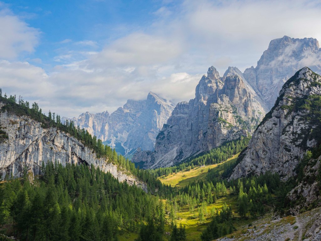 Sfruttiamo qualche pausa per girarci ad ammirare il paesaggio: ci troviamo su una verde e stretta vallata a V che porta lo sguardo direttamente sulle imponenti torri Sud del Monte Civetta, Torre Trieste (2458 m), Cima della Busazza (2894 m), Cima de Toni (3040 m).